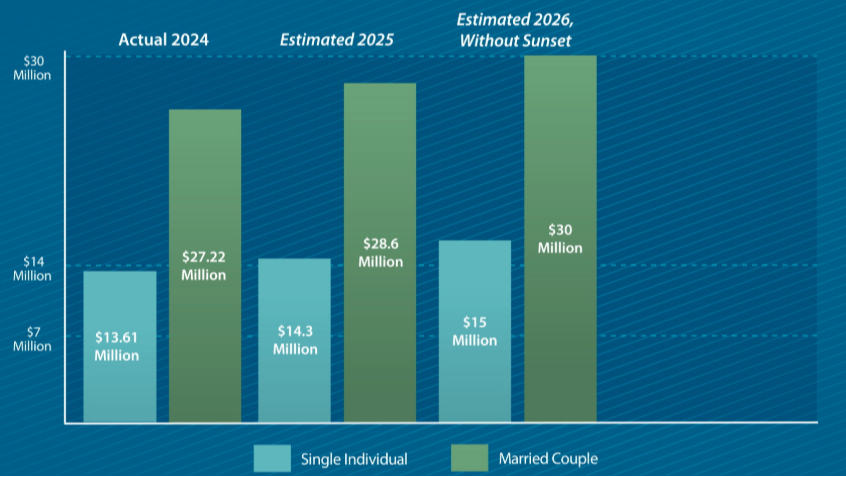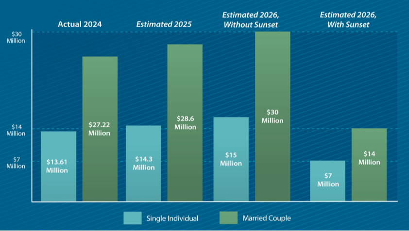 This increased estate tax exemption from the TCJA is set to sunset at the end of 2025. In 2026, that exemption amount would fall to less than half, with an exemption limit closer to $7 million per person, or $14 million for a married couple. As a result of this reduction, a single individual could end up paying more than $3 million in additional estate tax, and a married couple could pay more than $6 million extra.