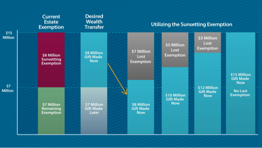 Instead, the transfers you make today are first allocated to whatever exemption is in place at your death. If lifetime gifts do not exceed that amount, the sunset is lost. If your lifetime transfers exceed that amount, then excess gifts can be used against the expired amount, but only if they occur before the sunsetting happens. In other words, to take advantage of the additional $8 million of estate tax exemption that might sunset after 2025, you first must transfer out the $7 million of exemption that would remain after the sunset.