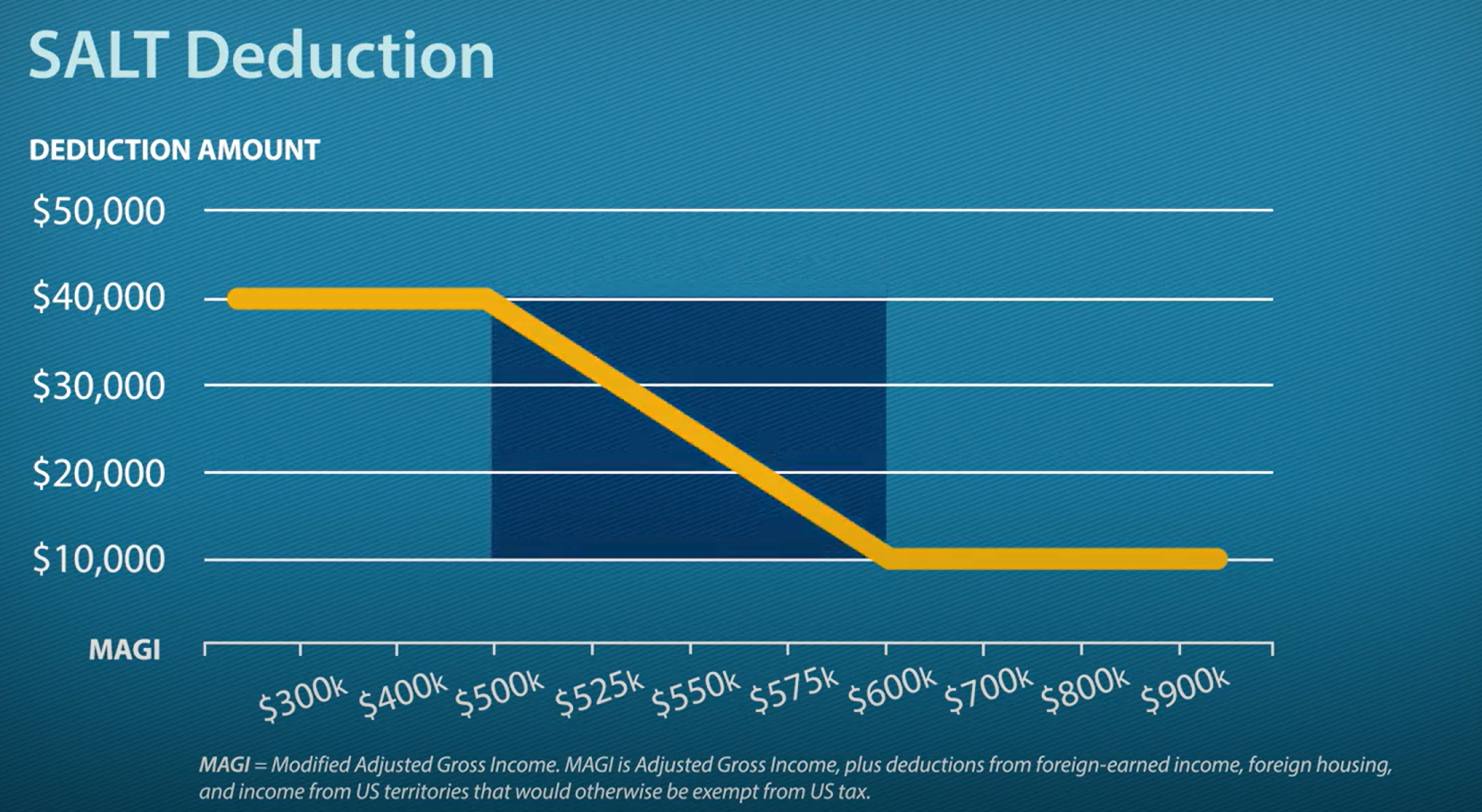 • State and Local Taxes (SALT): One of the biggest focuses throughout the budget reconciliation process has been the deduction for state and local taxes (SALT). The OBBBA has increased the limit to $40,000 (up from $10,000) for 2025 with an increase of 1% per year through 2029. Without further legislation, it will revert back to $10,000 in 2030. There are additional phaseouts based on income and tax filing status – this creates a window where taxpayers within that income range could see an effective tax rate on those dollars as high as 45% – connect with our team for more specific guidance and planning measures.