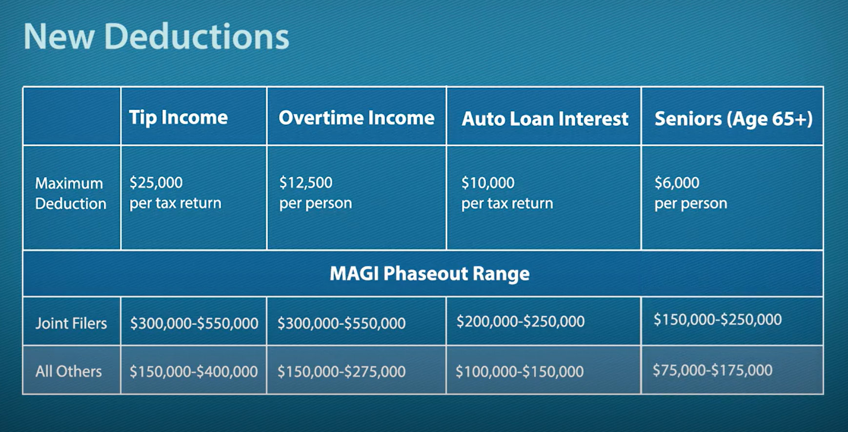 • Overtime Income: Joint filers can deduct up to $25,000 of qualifying overtime ($12,500 for single filers) The deduction applies only to the additional pay received above the standard rate and must be reported by the employer. It will also be subject to employment taxes.